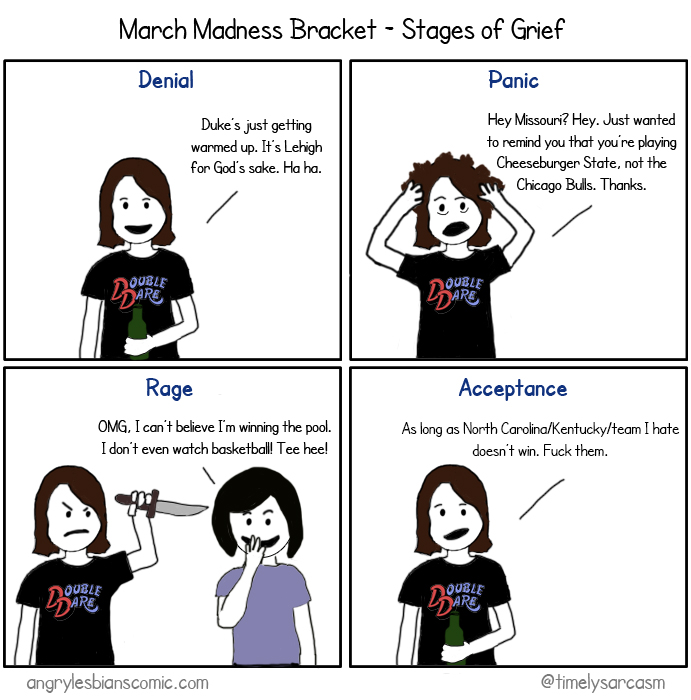 I actually made the brilliant move of not making a bracket this year, saving myself the annual $25 embarrassment of never winning my pool. Okay, so it wasn’t so much brilliance as laziness, since I waited too long to make one. But the benefit is getting to enjoy the annual bracket carnage without feeling the pain myself. Go Cheeseburger State!