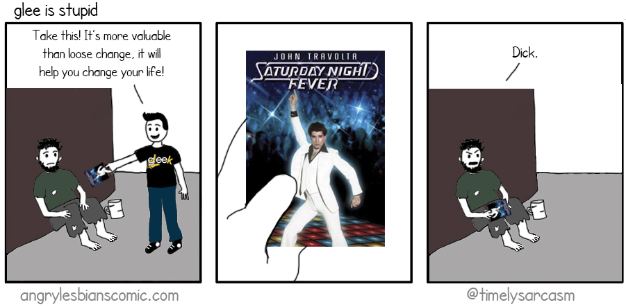 Only at McKinley High on Glee can watching a crusty copy of “Saturday Night Fever” suddenly inspire a lazy, directionless kid to get off his ass and make something of himself. High School guidance is overrated, the true wisdom lies with John Travolta shimmying through an 70s disco movie. Didn’t seem to work for my Uncle Ralph, though.