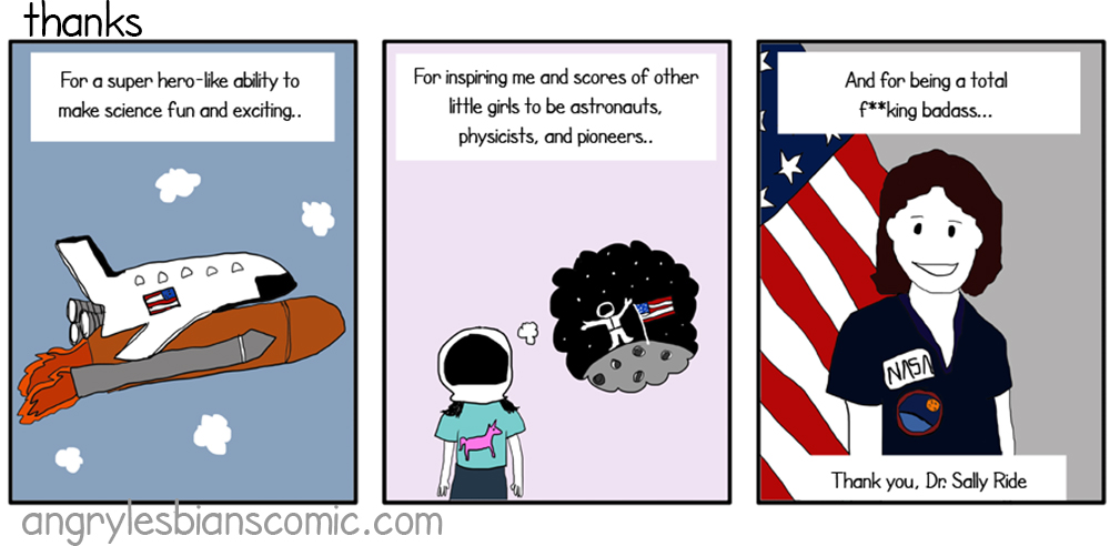 When I was a little girl, I wanted to do three things: play in the NBA, be Carmen Sandiego, and be an astronaut. I knew even at the tender age of 8 that girls didn’t play in the NBA, and that my parents would probably frown on “globetrotting criminal” as a career choice, so I thought I would be an astronaut instead. I never thought it was too high of a dream, or something that girls didn’t do thanks to Sally Ride. As it turned out, I hate math, but I will be forever grateful for her contributions not only to science and space travel, but to gay and straight women everywhere.