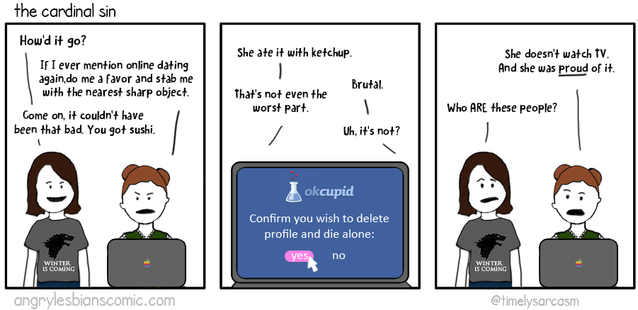 I’ll never understand the “we don’t watch TV” phenomenon, especially when it’s given as some kind of superiority trait like eating only organic food or not shopping at Walmart. It’s actually like admitting you’re a pop culture neophyte, while also ensuring you could never, ever win Jeopardy. They should make “I don’t watch TV” a tick box right under “sexual orientation” on all dating sites. I’m pretty sure it’d save everyone loads of time.