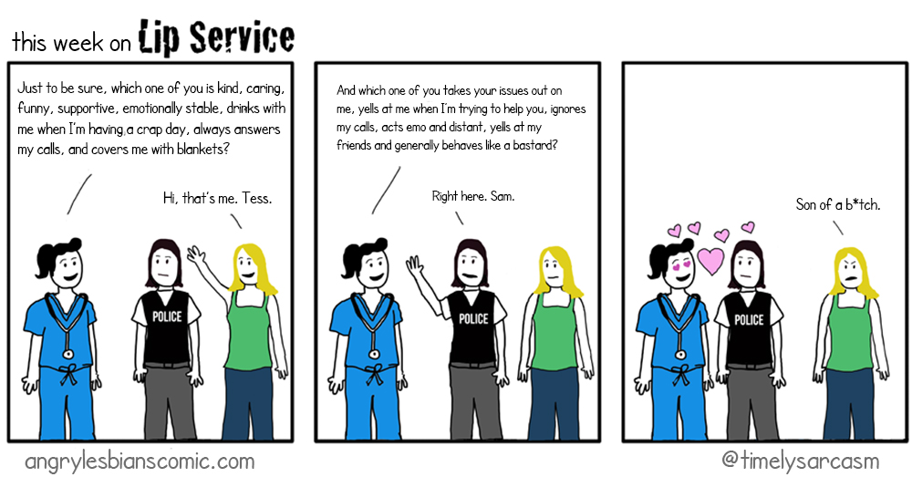 So I watched the finale of series 2 of Lip Service, and I’m surprised that it wasn’t just 45 minutes of people taking turns hitting Tess with two-by-fours. Seriously, someone explain to me the Sam/Lexy thing, because I don’t get it and I’m feeling really bitter about the whole thing.