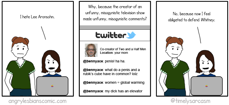 My first few drafts of this comic were nothing but the words “fuck you” and “lord of the asshats” with middle fingers drawn all around them. It’s really no surprise that the creator of ‘2 and a Half Men’ is a sexist dickbag, but I have to admit surprise/rage at how publicly he aired his stupidity – outside of his shitty show, that is. Besides feeling honor bound to defend Whitney (ugh), the other tragedy is that he actually lumped Tina Fey in with Chelsea Handler and Whitney Cummings. That alone should ban him from ever working in television again.